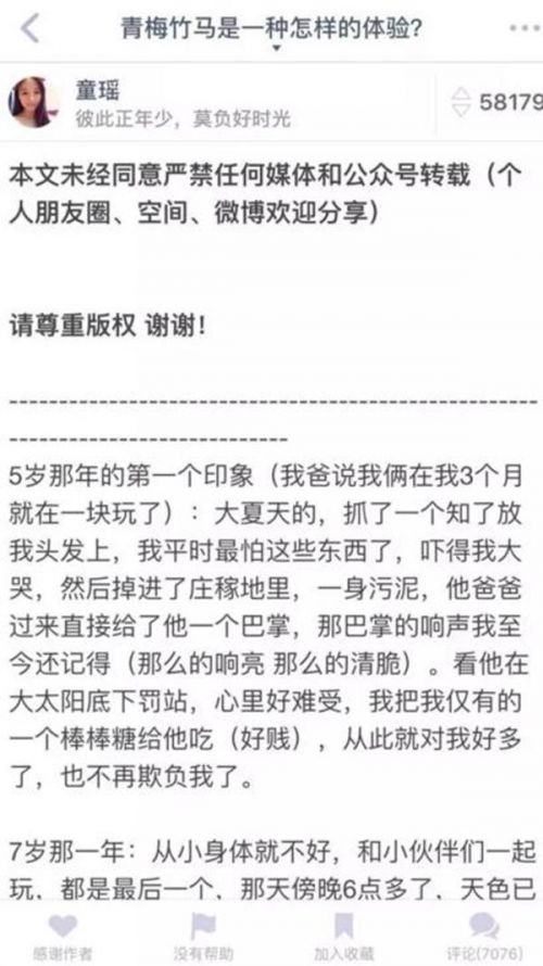“‘童瑤’在知乎上的第一個回答就是“青梅竹馬故事”。