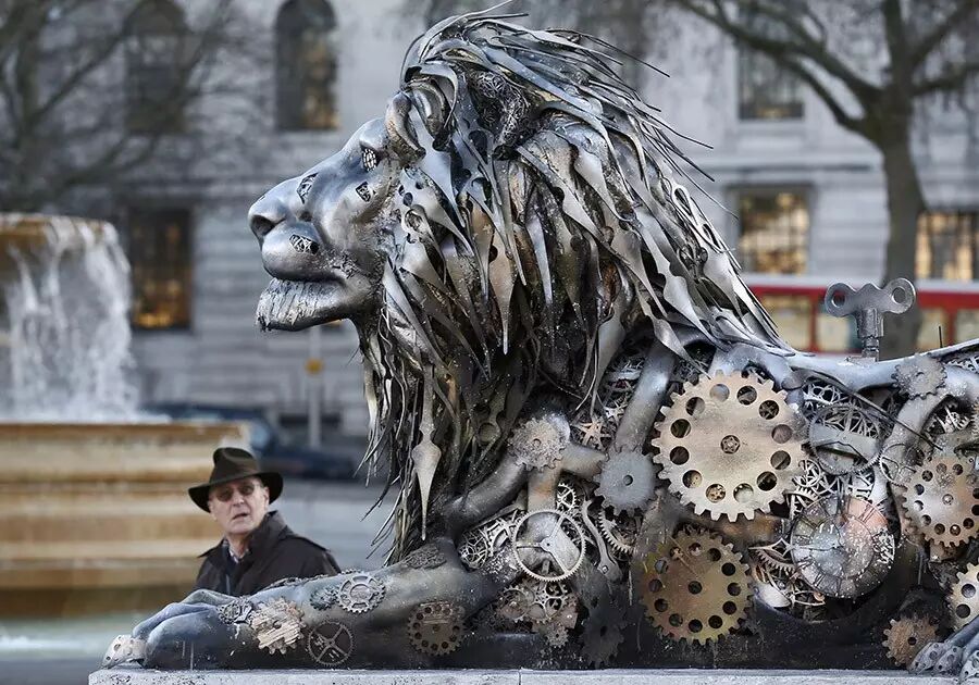 這座金屬制成的獅子雕像被《國家地理雜志》放置在特拉法爾加廣場原有的獅子雕像旁,以引起大眾對瀕危大型貓科動物處境的警醒。新華社/路透
