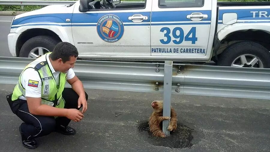 這張厄瓜多爾交通部門1月22日提供的照片顯示,在厄瓜多爾克韋多市的公路上,一名交警蹲在一只抱住隔離帶立柱的樹懶旁。