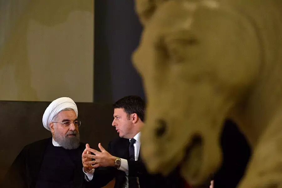 1月25日,在意大利羅馬,伊朗總統哈桑·魯哈尼(左)與意大利總理倫齊交談。