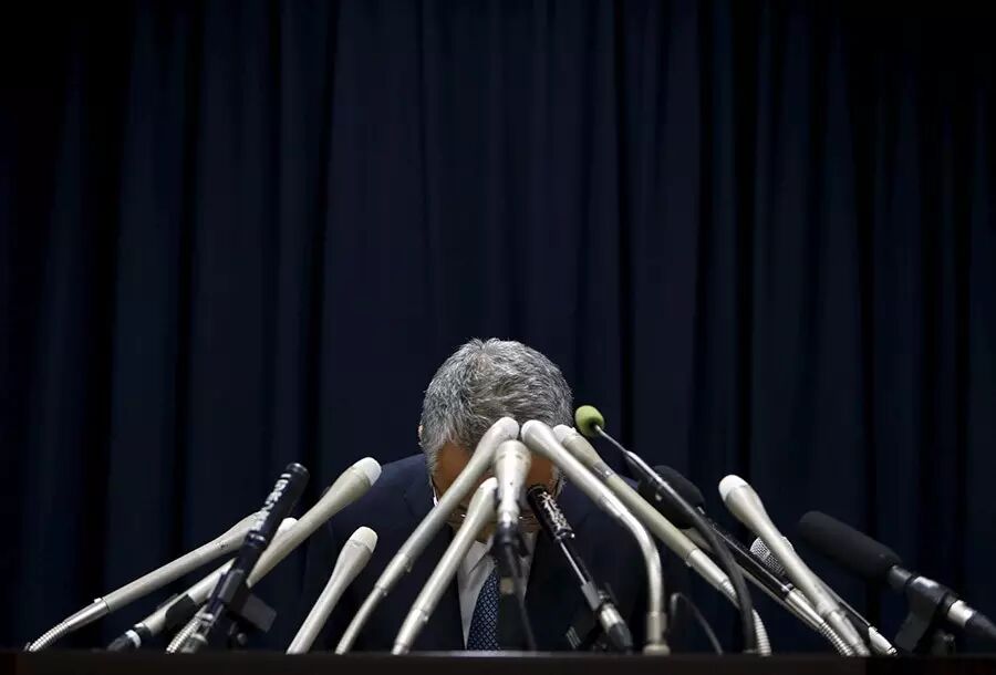 1月28日,在日本東京,日本經濟再生擔當大臣甘利明在出席記者會時鞠躬。