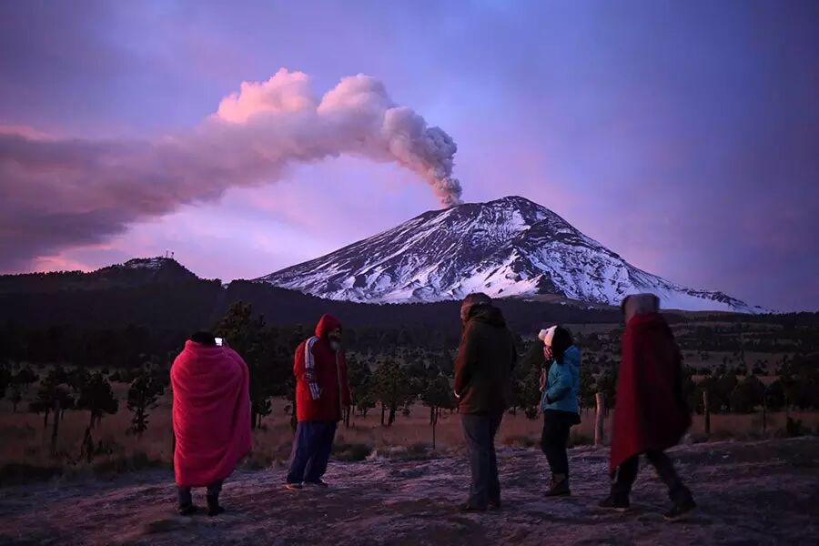 1月24日,在墨西哥首都墨西哥城附近,人們觀看正在噴發火山灰的波波卡特佩特火山。