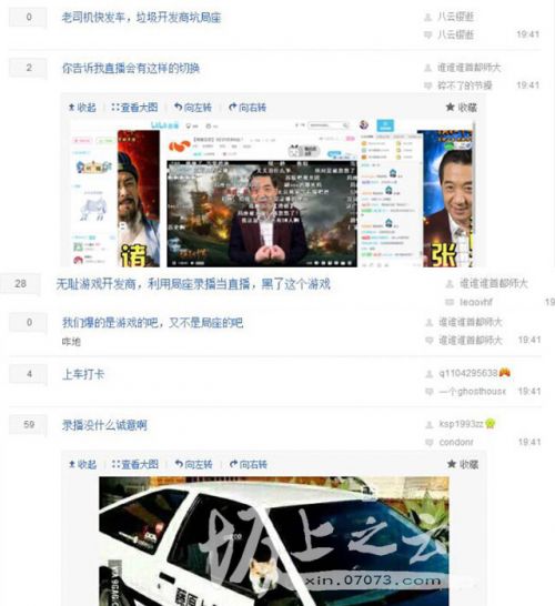 “局座”還在講課,坂上之云發現此時某三國游戲貼吧已遭不少老司機爆吧,不過這回老司機也不發18禁圖也不說臟話,就是吐槽游戲廠商忽悠粉絲。可能還是想看“局座”,爆吧行動持續時間不長就紛紛回到直播間了。