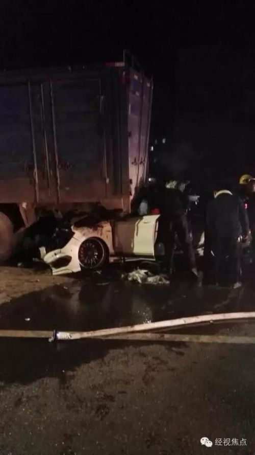 知情人提供的圖片顯示,白色跑車的車頭完全嵌入藍(lán)色大貨車的車尾貨廂下方,且已發(fā)生嚴(yán)重變形;有消防官兵圍在兩車之間的事故現(xiàn)場(chǎng),參與救援。