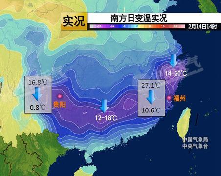2月14日14時,南方日變溫實況。(中國氣象局公共氣象服務中心全媒體產品室供圖)