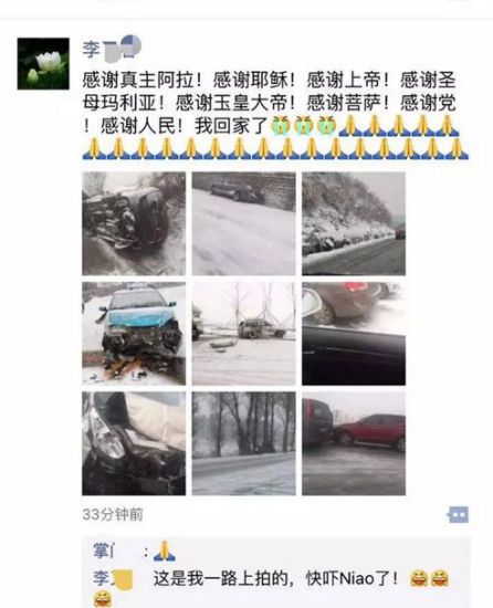 2月12日,一位80后女司機從米脂冒雪駕車回到榆林,一路險象環生,60公里國道走了4個小時,見了至少8起肇事,回家后心有余悸,發朋友圈把各路“神靈”謝了一個遍。
