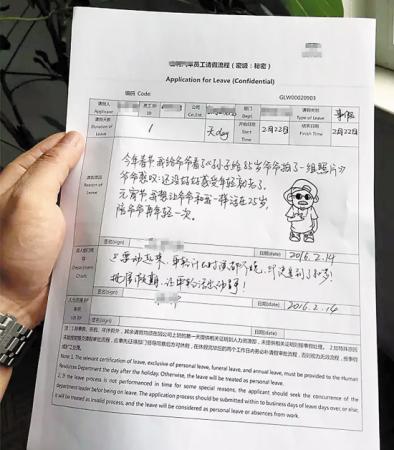 據(jù)悉,填寫(xiě)請(qǐng)假條的人是杭州一家大型汽車(chē)企業(yè)的員工顧先生,在請(qǐng)假條上,請(qǐng)假原因一欄寫(xiě)著“今年春節(jié),我給爺爺看了《孫子給85歲爺爺拍了一組照片》。爺爺感嘆,還沒(méi)好好感受年輕就老了……元宵節(jié)我想陪爺爺再年輕一次。”并在旁邊配上了手繪的“嘻哈老頑童”形象:墨鏡、棒球帽……儼然一副潮人模樣。
