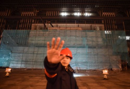 政知道在現場并沒有看到有施工人員,但圍擋外面的街道上有頭戴安全帽的人員,看到有行人拍照便跑過去進行阻止,“這里不能拍照,快走吧。”