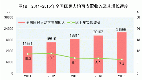 中新網2月29日電 據國家統計局網站消息,國家統計局今日發布了2015年國民經濟和社會發展統計公報。公報顯示,全年全國居民人均可支配收入21966元,比上年增長8.9%,扣除價格因素,實際增長7.4%;全國居民人均可支配收入中位數19281元,增長9.7%。