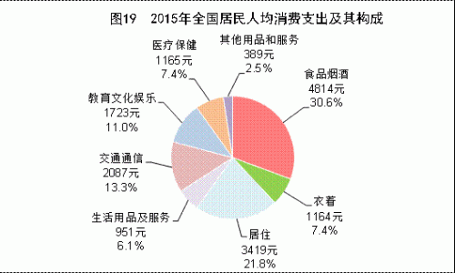 按常住地分,2015年城鎮居民人均可支配收入31195元,比上年增長8.2%,扣除價格因素,實際增長6.6%;城鎮居民人均可支配收入中位數為29129元,增長9.4%。農村居民人均可支配收入11422元,比上年增長8.9%,扣除價格因素,實際增長7.5%;農村居民人均可支配收入中位數為10291元,增長8.4%。全年農村居民人均純收入為10772元。全國農民工人均月收入3072元,比上年增長7.2%。全國居民人均消費支出15712元,比上年增長8.4%,扣除價格因素,實際增長6.9%。按常住地分,城鎮居民人均消費支出21392元,增長7.1%,扣除價格因素,實際增長5.5%;農村居民人均消費支出9223元,增長10.0%,扣除價格因素,實際增長8.6%。