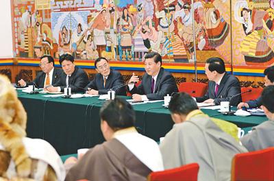 2013年3月9日,中共中央總書記、中共中央軍委主席習(xí)近平參加十二屆全國(guó)人大一次會(huì)議西藏代表團(tuán)的審議。