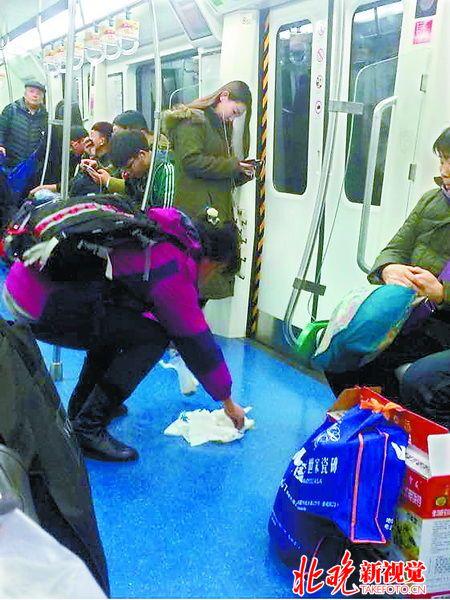 昨晚8點多,一位名叫“還在學走路”的網友,在百度貼吧“北京國安吧”里發布了一個帖子。帖子中提到:“剛剛在地鐵9號線,一個乘客暈車,吐了一地,到站開門后下車走了,圖片上這位大姐,從包里掏出紙巾和塑料袋,將地上的污物全部清理干凈!”