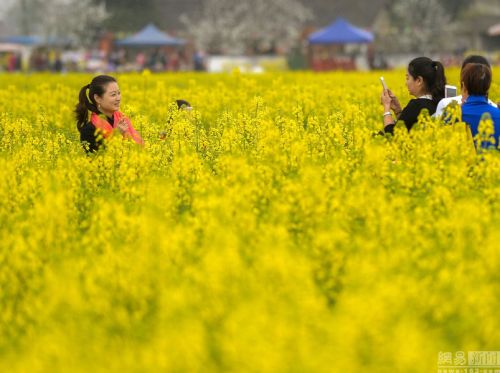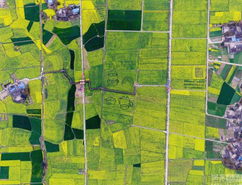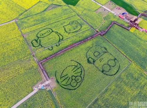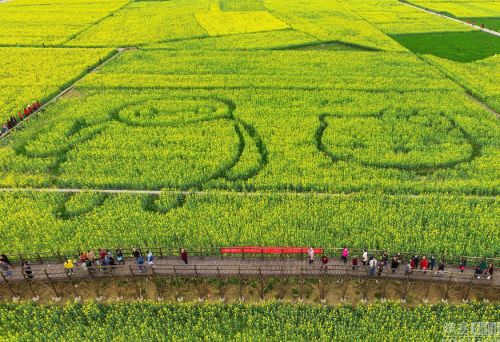 2016年3月8日,四川廣漢,廣漢西高鎮李堰村萬畝油菜花盛開,今年最大亮點就是四個卡通人物圖案,分別是機器貓、hellokitty、大白、小黃人,吸引絡繹不絕的游客賞花之余拍照留念。