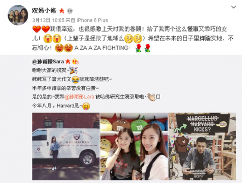 她稱,“要感謝的人有很多,感謝在復旦英語系修過的每一門課程,遇到的每一位老師,讓我對英語的熱愛不斷加深。感謝父母的信任和鼓舞,讓我心中的等待慢慢化為了期待……抒情一下:你好,哈佛。”文末,她還說,“二驢還沒畢業,繼續寫畢業論文去啦!”而姐姐孫雨朦則在微博上寫道:“感謝大家的祝賀,半年多申請季的辛苦沒有白費。我和孫雨彤被哈佛研究生院錄取啦。今年八月,哈佛見。”