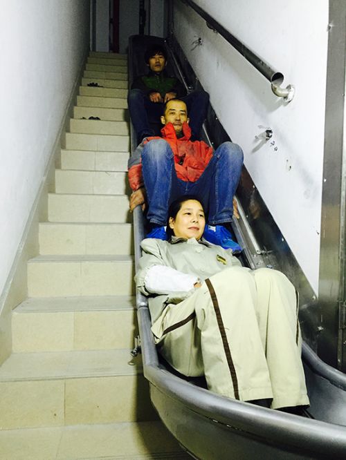 隨后,澎湃新聞?dòng)浾哂H自體驗(yàn)了一把滑梯。在裹緊保護(hù)衣后,記者拉下裝置開關(guān),扣在墻上的滑梯迅速打開,自動(dòng)接通,滑行一層僅需二三秒,整個(gè)過程并無不適感。經(jīng)測試,從26層滑至底層只需一分半鐘。