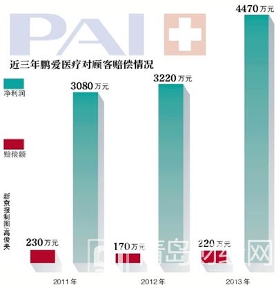 公司招股書顯示,2011年、2012年、2013年,鵬愛醫療因客戶對服務不滿或醫療過失提出索償而支付的賠償分別為人民幣230萬元、170萬元、220萬元,占相應期間收入的0.8%、0.5%、0.5%,而同期,公司凈利潤分別為3080萬元、3220萬元、4470萬元。以此計算,2013年,鵬愛醫療用于賠償的費用約占到凈利潤的5%。