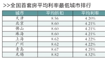 目前,十大城市的平均利率折扣都有加大。以天津為例,目前提供房貸業務的16家銀行全部提供優惠利率,其中14家提供8.5折優惠,兩家提供9折優惠,致使其平均利率低至4.20%。