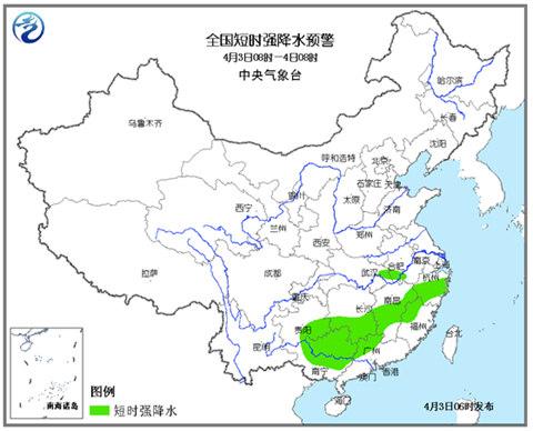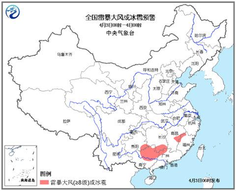 預計4月3日08時至4日08時,貴州西南部、廣西中北部、湖南南部、江西東部、福建西北部、廣東北部等地局地可能有8-10級雷暴大風或冰雹天氣;貴州西南部、廣西中北部、湖南南部、江西中部、廣東北部、福建西北部、安徽西南部、浙江中部等地的部分地區將有短時強降水,小時雨強20-50毫米。