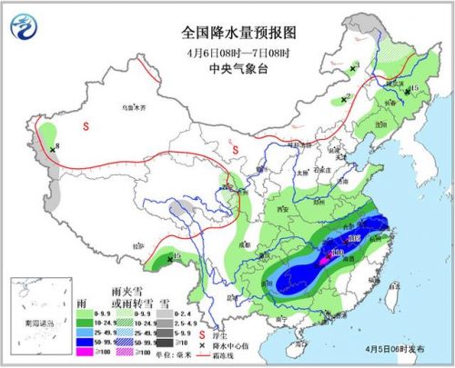 5日08時至6日08時,青海南部等地的部分地區有小雪或雨夾雪;江漢大部、江淮大部、江南北部、貴州東部、云南西北部、西藏東南部等地有中到大雨,其中,湖北東部、安徽南部、江西北部、湖南北部、貴州東部等地的部分地區有暴雨,局地大暴雨(100~110毫米)。內蒙古等地有4~5級風。