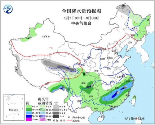 6日08時至7日08時,新疆西南部、西藏西部、青海東部、黑龍江西北部等地有小雪或雨夾雪;江淮、江漢東部、江南北部和西部、貴州中東部、廣西北部等地的部分地區有中到大雨,其中,蘇皖南部、湖北東南部、江西北部、湖南中部、貴州東南部、廣西東北部等地的部分地區有暴雨,局地大暴雨(100~110毫米)。內蒙古大部、東北地區南部等地有4~6級風。南疆盆地、甘肅中部、內蒙古西部等地有揚沙或浮塵。東海南部、黃海南部有6~7級風,陣風8級;東海北部有7~8級風,陣風9級。
