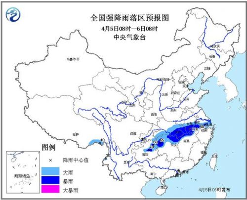 預計,5日08時至6日08時,江淮西部、江漢南部、江南北部、貴州東北部、云南西北部等地有大雨,其中,安徽南部、湖北東部、江西北部、湖南北部、貴州東北部等地的部分地區有暴雨,局地大暴雨(100~110毫米);上述部分地區有短時強降水,最大小時雨強20~40毫米,局地伴有雷暴大風或冰雹。中央氣象臺4月5日06時發布暴雨藍色預警。