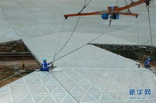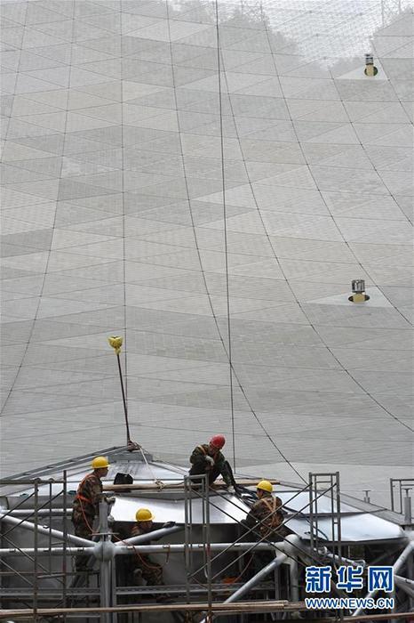 工作人員在安裝500米口徑球面射電望遠(yuǎn)鏡(FAST)工程反射面面板