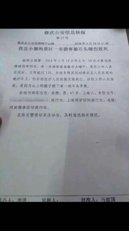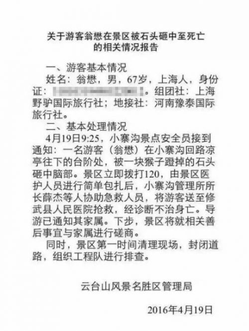 網(wǎng)上流傳的一份云臺山風(fēng)景名勝區(qū)管理局情況報告顯示,事發(fā)時間為4月19日,被石頭砸中至死亡的男性游客名叫翁懋,67歲,上海人。當(dāng)天上午9:25,“小寨溝景點(diǎn)安全員接到通知,一名游客(翁懋)在小寨溝回路涼亭往下的臺階處,被一塊猴子蹬掉的石頭砸中腦部”,情況報告中稱,事發(fā)后景區(qū)立即撥打120并由景區(qū)醫(yī)護(hù)人員先行簡單包扎,后協(xié)助急救人員將其送至修武縣人民醫(yī)院,但翁懋“經(jīng)診斷不治身亡”。