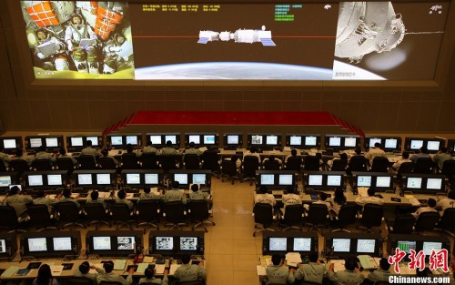 資料圖:北京時間2013年6月13日13時18分,天宮一號目標飛行器與神舟十號飛船成功實現自動交會對接。圖為北京航天飛行控制中心指揮大廳大屏幕播出對接實時畫面。中新社發 孫陽 攝