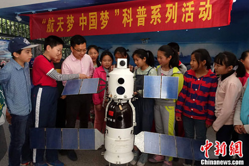 資料圖:2016年4月19日,安徽航空科普協會工作人員為學生們講解航天知識。中新社記者 張婭子 攝