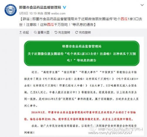 對此,5月8日,即墨市食品藥品監督管理局官方微博以及青島市食品藥品監督管理局官方微信均發布消息確定,刷爆朋友圈的這則消息是對2015年3月份“問題西瓜”事件的報道,屬于舊聞翻炒,當時并未發生人員死亡事件。另外即墨市食品藥品監督管理局今年3月專項抽檢西瓜類食品農產品,合格率達99.3%,未發生上述視頻中情況