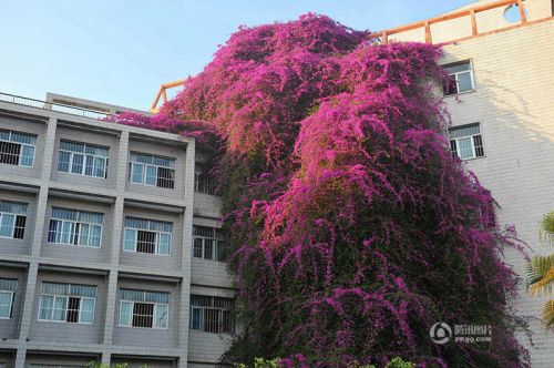 5月20日,廣西南寧,在廣西建設職業技術學院內,一株足有7層樓高的巨型三角梅依附著教學樓的墻體一直從地面攀上樓頂,格外引人注目。盛開的鮮花花色鮮艷茂盛,蔚為壯觀,遠觀就像是一面印在墻上的“鮮花瀑布”,吸引了不少市民前往觀賞。