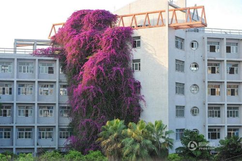這株三角梅主干直徑約10厘米,密密麻麻的枝條從主干分叉開來,順著教學樓1樓墻角爬上了5樓。