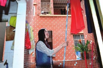 馬泮輝在廣東的出租屋內晾衣服。