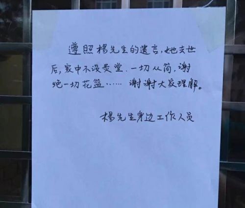 5月26日下午七點,與楊絳先生同住在南沙溝小區的住戶路過楊先生家門口時拍到了貼在門口的告示,內容顯示:“遵照楊先生的遺言,她去世后,家中不設靈堂,一切從簡,謝絕一切花籃……謝謝大家理解。”落款為:“楊先生身邊的工作人員”。