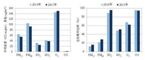 2015年74個新標(biāo)準(zhǔn)第一階段監(jiān)測實施城市六項污染物年際比較