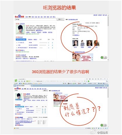 昨日開始,不少網友發現在使用360瀏覽器“百度一下”時,竟然再也搜不到之前經常能找到的內容了,網友“鈕裕海”在微博吐槽,通過360瀏覽器用百度搜索“李宇春”時,原來搜索結果頁面右方的代表作品、身高、職業,以及“其他人還搜”版塊都沒有了,但使用IE等其他瀏覽器時,頁面都可完整呈現。