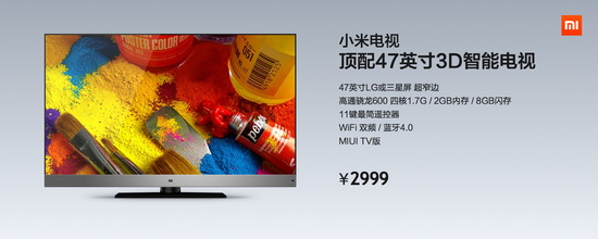 雷軍同時還發布了外界猜測已久的小米電視,雷軍介紹,“小米電視采用47寸LG\三星1080p頂級高清屏,配備高通8064四核1.5G處理芯片,它是一臺電視機+小米盒子+安卓游戲機的組合,并且小米電視將以定價2999元發售?!?/P>