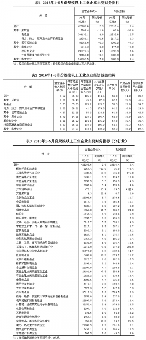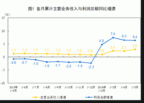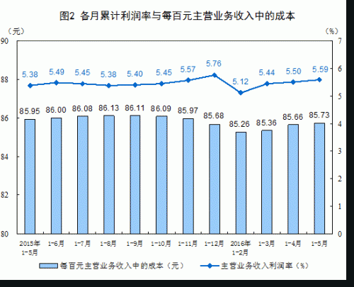 1-5 月份,規模以上工業企業實現主營業務收入 426285.6 億元,同比增長 2.9% ;發生主營業務成本 365458 億元,增長 2.7% ;主營業務收入利潤率為 5.59% 。