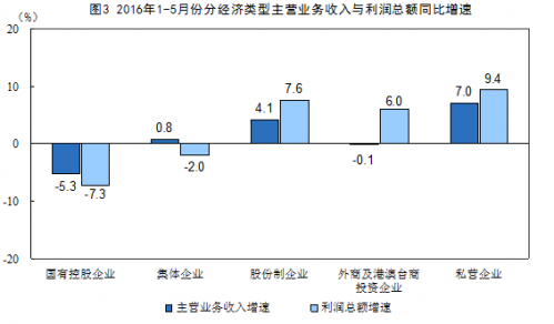 1-5 月份,在規模以上工業企業中,國有控股企業實現利潤總額 4290.2 億元,同比下降 7.3% ;集體企業實現利潤總額 177.8 億元,下降 2% ;股份制企業實現利潤總額 15992.9 億元,增長 7.6% ;外商及港澳臺商投資企業實現利潤總額 6082.9 億元,增長 6% ;私營企業實現利潤總額 8488.9 億元,增長 9.4% 。