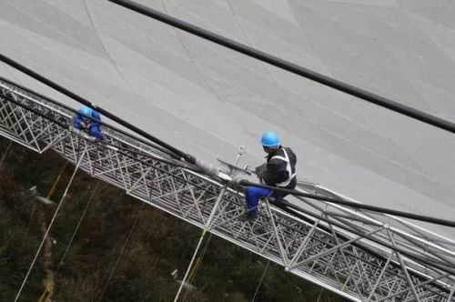 FAST的設計目標,是把覆蓋30個足球場的信號,聚集在藥片大小的空間里,否則,就無法監聽到宇宙中微弱的射電信號。500米的結構,處處都是頭發絲般毫米級的精度要求。用來編織索網的7000多根手臂般粗細的鋼纜,每一根的加工精度都被控制在一毫米以內;最終的500米口徑的天線精度是三個毫米,每一塊小面板的制造精度是1.5個毫米。