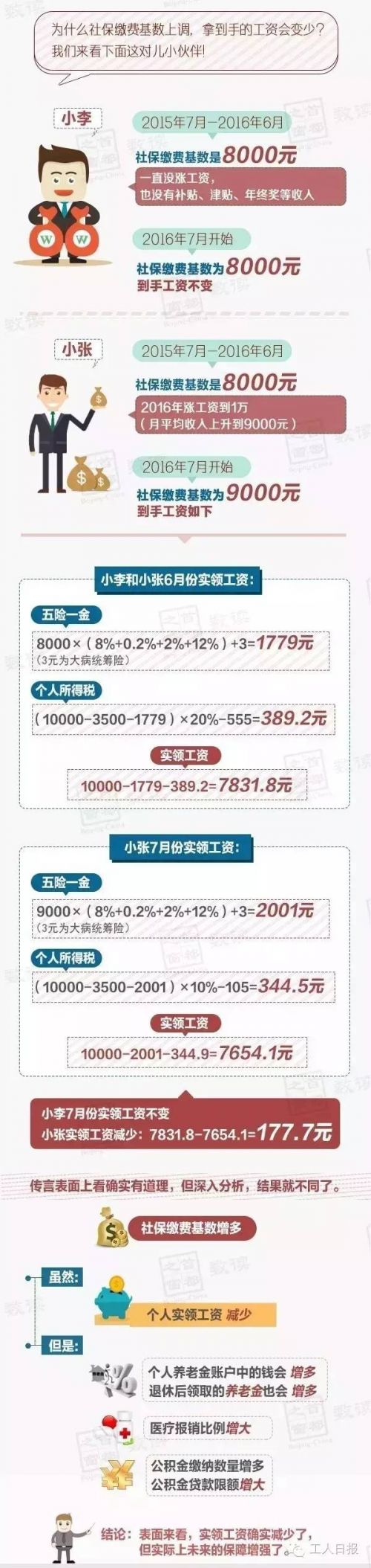6月15日,北京市社保中心發(fā)布了《關(guān)于統(tǒng)一2016年度各項(xiàng)社會(huì)保險(xiǎn)繳費(fèi)工資基數(shù)和繳費(fèi)金額的通知》。文中指出,2015年北京市職工的平均工資為85038元,月平均工資為7086元,較2014年6463元提高了623元。2016年度社保繳費(fèi)基數(shù)要參考這個(gè)平均工資,7月份開(kāi)始執(zhí)行,如果你上一年度工資漲了,那么你的社保繳費(fèi)基數(shù)也要上調(diào),這意味著到手的工資又要少了。