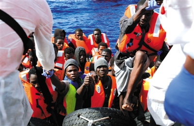 6月23日,利比亞海岸附近,“海上移民援助站”救援船在利比亞海岸20海里處營(yíng)救難民。