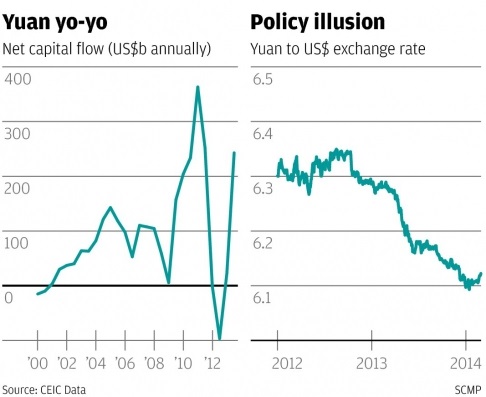如下圖所示,左圖顯示了中國(guó)的凈資本流入規(guī)模,右圖顯示了人民幣匯率:
