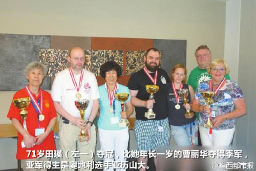 @華西都市報:【中國7旬大媽奧地利麻將公開賽奪冠】在18日的奧地利第十一屆麻將公開賽上,應邀參加的中華麻將隊陡發神威,71歲老太太田瑛一舉奪冠,72歲曹麗華奪季軍,亞軍得主是奧地利選手亞歷山大。這支參賽中國隊以陜西西安的老年人為主,共8人,全是過了退休年齡的大叔大媽們。