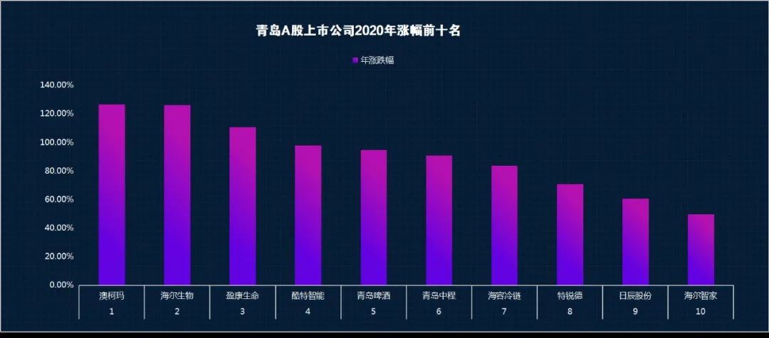 同花順數據顯示,年度漲幅前十為澳柯瑪、海爾生物、盈康生命、酷特智能、青島啤酒、青島中程、海容冷鏈、特銳德、日辰股份、海爾智家。