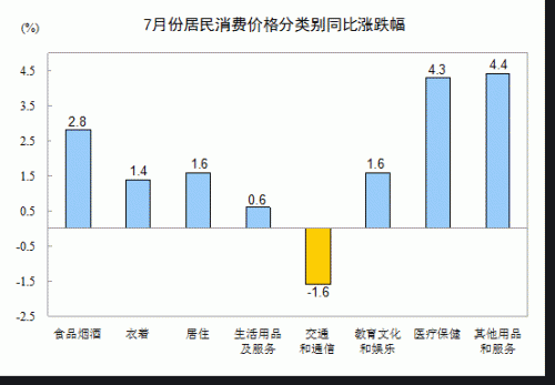 7月份,其他七大類價(jià)格同比六漲一降。其中,其他用品和服務(wù)、醫(yī)療保健、居住、教育文化和娛樂、衣著、生活用品及服務(wù)價(jià)格分別上漲4.4%、4.3%、1.6%、1.6%、1.4%、0.6%;交通和通信價(jià)格下降1.6%。