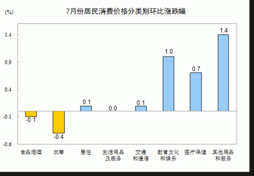 7月份,其他七大類價(jià)格環(huán)比五漲一降一平。其中,其他用品和服務(wù)、教育文化和娛樂、醫(yī)療保健、居住、交通和通信價(jià)格分別上漲1.4%、1.0%、0.7%、0.1%、0.1%;衣著價(jià)格下降0.4%;生活用品及服務(wù)價(jià)格持平。