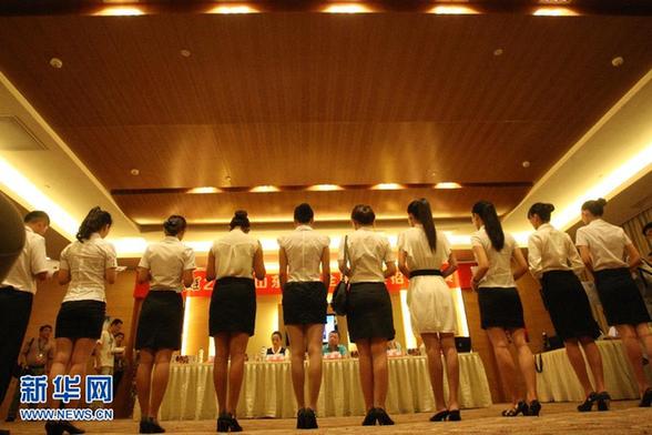7月25日,在山東煙臺南山皇冠假日酒店,參加空乘海選的選手接受評委面試。