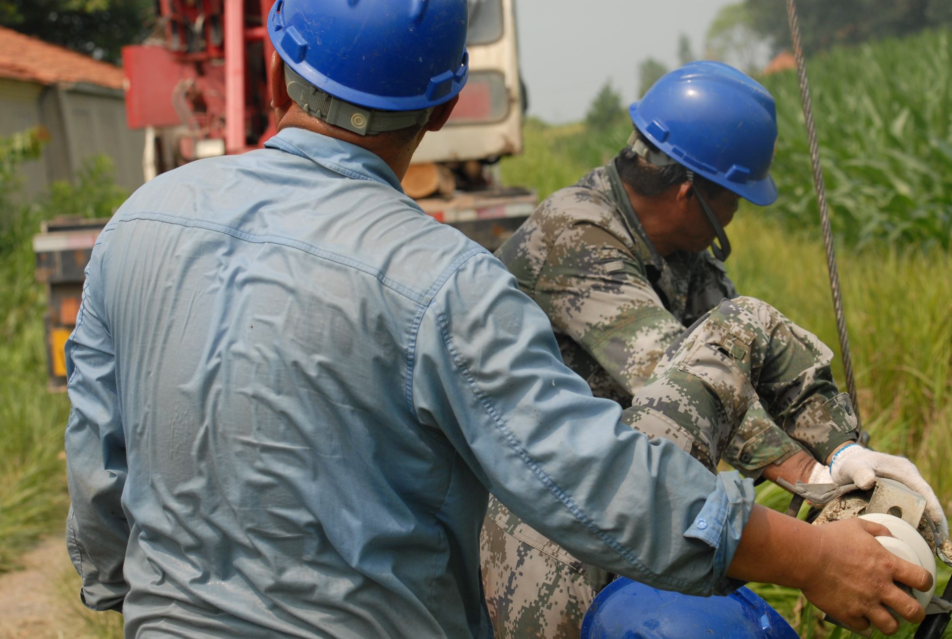正午的陽光越來越毒,盡管記者沒怎么動彈,身上已經被汗水打透,臉和脖子也是火辣辣的感覺。但朱永義說:像這種‘燒烤’的日子幾乎天天都在過,時間久了就習慣了。在為他人保電送涼爽的同時,朱永義和他的同事們卻要頂著烈日的“烤”驗,堅守崗位,除了中午一小時的吃飯時間,一天下來,他們有10個小時都是在太陽底下。他們正聚精會神做拉線U型線夾。汗水不住流入眼睛,遮住視線,此時他們便用毛巾擦一擦,誰也說不清到底用毛巾擦過多少次?!艾F在還不是最熱的時候,午飯后整件衣服都會濕透,穿在身上那是‘非一般’的感覺?!币幻┕と藛T打趣道。為了補充迅速流失的水分,電力工人們每天至少要喝10瓶500毫升的純凈水。