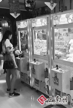記者走訪昆明各大商場發現,抓娃娃機幾乎成了商場標配。在位于北京路的一家大型超市3樓門口,擺著4臺五顏六色的抓娃娃機,每臺機子里的玩偶款式不同,吸引了不少小朋友和年輕情侶“一試身手”。